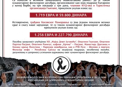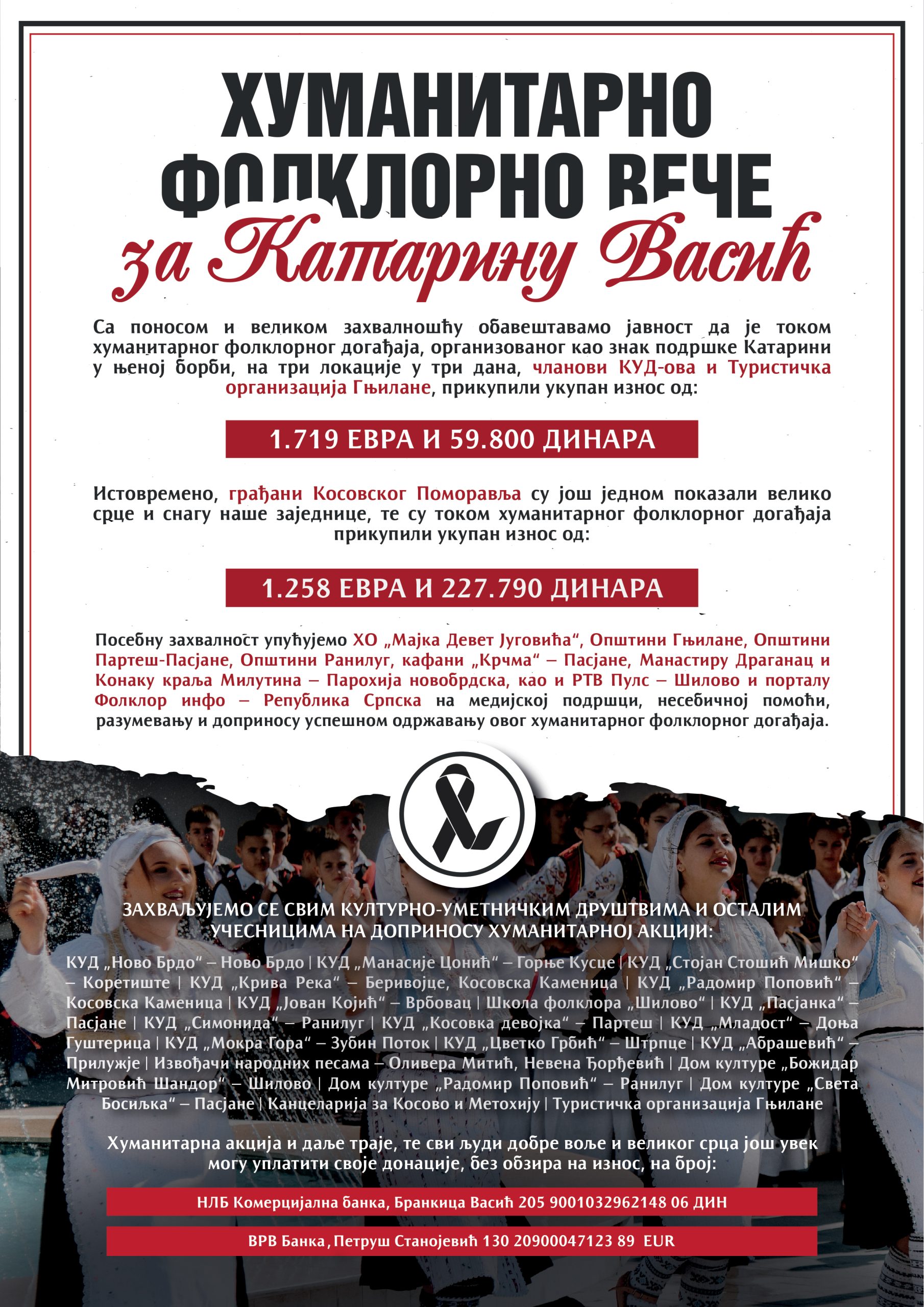 Домови културе и фолклорна друштва Косовског Поморавља и шире, у сарадњи са Туристичком организацијом Гњилане и уз подршку Канцеларије за Косово и Метохију, организовали су хуманитарно фолклорно вече као знак подршке Катарини Васић у њеној борби, одржано на три локације, три дана заредом: